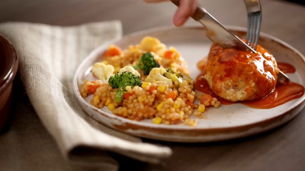 Plate the mini turkey meatloaves alongside the roasted vegetable couscous. Garnish with fresh parsley for a pop of color and freshness.